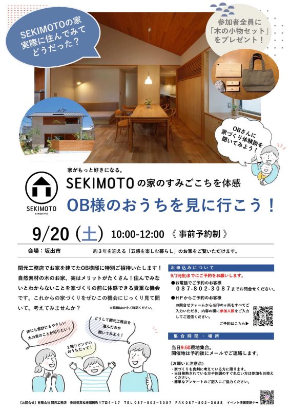 9月20日(土)「SEKIMOTOの家のすみごこちを体感 OB様のおうちを見に行こう!」を開催します。