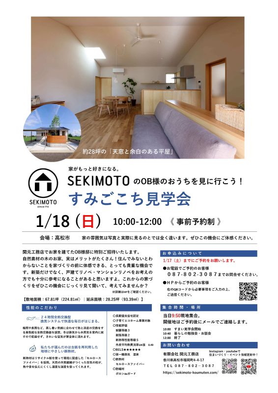 1月18日(日)「SEKIMOTOのおうちを見に行こう!すみごこち見学会」を開催します。